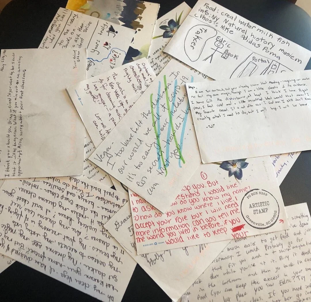 SB: It's really true. It has been wild to compare the responses of audience members to different actors: they are partly reacting to how the actors improv, but also to their handwriting. It's a different voice—some read warmer or sharper-- but in all instances a personality comes through. You can also convey so many things about circumstances and what's happening in that moment through style. And we love the marginalia and things like notes on the envelopes. The Otherwise series, which is Natalie Ann Valentine’s Wiccan adventure, is the most visual with evocative drawings and doodling. And I would say it's a little bit of a mood piece. Story is not the leading Aristotelian element. And it often evokes a similar response from its audience. We're getting back beautifully drawn pieces of art and an energy that plays off what they received.