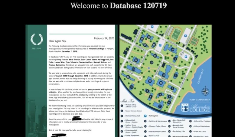 The experience begins with a cryptic email delivered to the address used to register for the event, inviting viewers to enter the archives of an investigation. The viewer is then greeted with an accessible, easily navigable site detailing key terms used in the Alexandria College vernacular, a campus map, and profiles of each of our main characters. Each video or phone call adds another snippet to the story, told out of chronological order and spanning almost eight months. For the aid of audience members, each element also comes with a transcript to help follow the story, if needed.